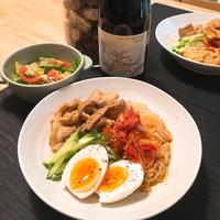 タレは食べる時にかけることにしました。キムチ、トマト、きゅうり、豚肉、みょうが。温泉卵が割れてしまったけど、キムチの辛さをマイルドにしてくれました。