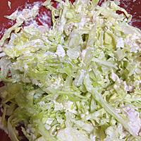 - 1 キャベツを千切りにし、ボウルに入れ塩をふり、塩もみして水気を切っておきます。