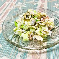マヨネーズを減らしてサワークリーム追加、塩の代わりにグリーンオリーブで塩分を足しました。キャベツは食感を良くするため色紙切りにして塩揉みしたら水に通してから絞っています。