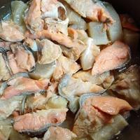 冷凍しておいた大根と鮭、ついでにしめじも入れました。