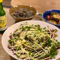- 3 お皿に1、かいわれ大根の順にのせ、2と粉チーズをかけて完成です。
