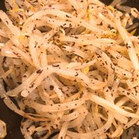 - 1 耐熱ボウルにもやしを入れ、ふんわりとラップをかけ、600Wの電子レンジでしんなりするまで3分程加熱します。