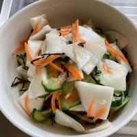 2度目です!2倍で作りました。カブの葉がなかったのできゅうりを。酢がきついのが苦手なので酢をひとさじ減らして、さらにレンジで1分加熱して、冷めてからあえました。