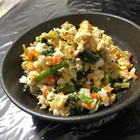 レンジで加熱したほうれん草はとても熱いので粗熱が取れてから切ってくださいね。 このレシピではにんじんを加熱していませんが、加熱してもおいしくいただけます。 ゆで卵は白身を切ってから黄身をほぐして混ぜると形が残って彩りよく仕上がります。
