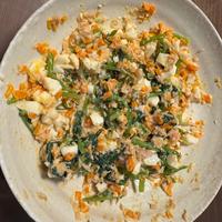 - 4 1に2と3とツナと (A)を入れ混合わせ、器に盛り付けて出来上がりです。