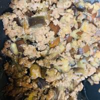 - 4 1を入れ炒め、油がなじんだら中火のまま2を入れて炒め合わせ、汁気がなくなり、豚ひき肉に火が通ったら火から下ろします。