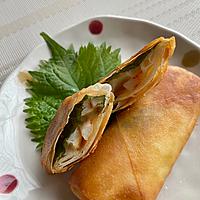 - 2 春巻きの皮に大葉、1、ピザ用チーズを乗せ、七味唐辛子をかけて巻きます。巻き終わりは水溶き薄力粉で閉じます。