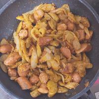 - 4 タマネギがしんなりしたら、ウインナーを入れて炒めます。