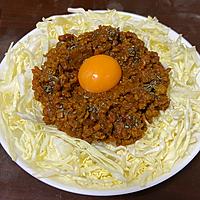 - 8 お皿にごはん、キャベツ、7を盛り付けます。卵黄を乗せ、パセリを散らして完成です。