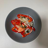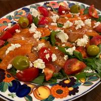 新鮮なサーモンをメインに、ルッコラやラディッシュ、カラフルミニトマトを添えた見た目も鮮やかな一品です。オリーブオイルとレモン汁のさっぱりとしたドレッシングに、ピンクペッパーのアクセントが効いています。カッテージチーズやモッツァレラチーズを添えると、まろやかな味わいが加わり、ワインやカクテルのおつまみにもぴったり。おもてなしにも喜ばれる華やかな一皿に仕上がります。