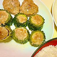 半分に切ったゴーヤをボートに見立てた、肉詰めです。 そのまま食卓に並べると存在感があります。 切ってから器に盛り付けてもきれいです。 そのままでも味が付いていますが、しょうゆやケチャップを付けて食べてもおいしいです。