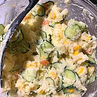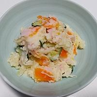 - 7 5を熱いうちにマッシャーで潰します。3、4、6、マヨネーズソースの材料を入れてよく混ぜ合わせ、(A)を入れて味を調えます。