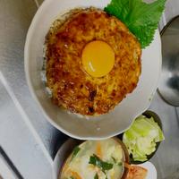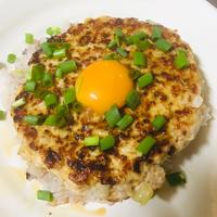 大きなつくねをどかーんとご飯にのせた丼のレシピです。フライパンでそのまま焼くので、成形する手間を省けます。タレをたっぷり絡めてごはんと一緒にいただくと、とってもおいしいです。ごはんにのせずにそのままでもおいしく召し上がれます。