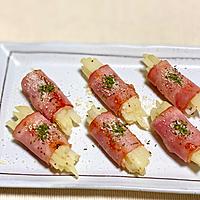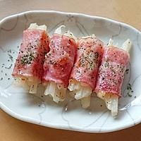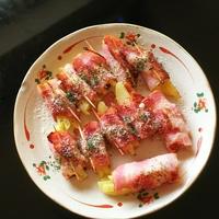 - 3 薄切りハーフベーコンを広げ、手前に2をのせて巻き、巻き終わりを爪楊枝で留めます。