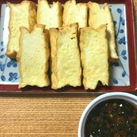 - 2 中火で熱したフライパンにごま油をひき、厚揚げを入れて焼きます。両面に焼き色が付いたら火から下ろし、1cm幅に切ります。