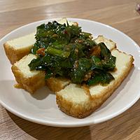 ニラソースがけ厚揚げステーキはいかがでしょうか。メインのおかずにもなるレシピです。豆板醤の辛みとオイスターソースの旨みが効いたニラソースをカリッと焼いた厚揚げにかけると、とてもおいしいですよ。ぜひお試しくださいね。