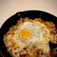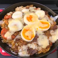 スキレットにサラダ油を塗り、コンロで鶏肉を最初に表面が焼けるくらいスキレットで焼いてから、鶏肉の上にカレーを混ぜたご飯を乗せ、その上にカレーをかけ、ゆで卵を乗せ、とろけるスライスチーズを細かく切り、散らばせました。