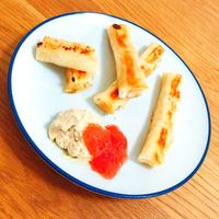 - 6 1の真ん中に5を乗せスティック状に巻き、水溶き薄力粉で留めます。