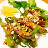 万願寺とうがらしの丸ごと肉巻きを、チリソースでエスニック風にいただくレシピのご紹介です。甘みのあるチリソースに、万願寺とうがらしの程よい苦味と、豚バラ肉の旨味がとてもよく合います。仕上げのライムとピーナッツがとてもよいアクセントになりますよ。
