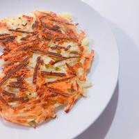 - 4 中火で熱したフライパンにサラダ油をひいて3を4等分にして入れ、薄く広げて、桜エビを散らします。片面5分ずつ焼きます。