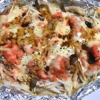- 2 アルミホイルにもやし、1、明太子、ピザ用チーズの順にのせ、アルミホイルを閉じます。