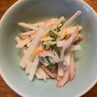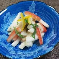 長芋のみ先に漬け汁に漬けてしんなりするまで暫く時間を置き、食べる直前に大葉とカニカマを和えました。