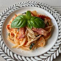 新鮮なトマトをすりおろして作る本格派パスタです。トマトの皮が気にならず、フレッシュな旨みと爽やかな酸味が特徴。にんにくとベーコンの香ばしさが食欲をそそり、ジュワッと染み出すトマトの甘みが絶妙です。材料はシンプルながら、モチモチとした食感の麺にソースがよく絡んで、まるでお店のような味わい。バジルの香りが夏らしさを演出し、さっぱりとした後味で何度でも食べたくなります。