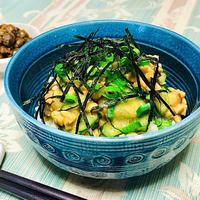 豆腐1/2丁、きゅうり、もずく、めかぶ、ひき割り納豆をかけて。暑い日にさっぱり食べれて美味しいです。