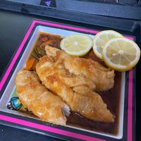- 4 グリーンリーフをのせたお皿に盛り付け、レモンを添えて完成です。