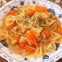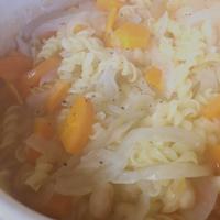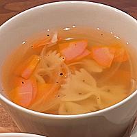 レモン香るコンソメパスタスープです。ほんのり香るレモンの風味がアクセントになり、普段とひと味違うコンソメスープに仕上がりました。リボンの形をしたマカロニが入っていて、見た目も可愛いですよ。ぜひ試してみてくださいね。
