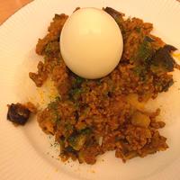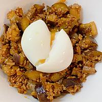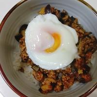 シンプルな調味料でも本格的な味わいが楽しめるナスとミートソースのコラボです。ナスのゴロゴロした食感と、ケチャップベースの優しい味付けが、白いご飯とベストマッチ。トロッとした温泉卵との相性も抜群で、コクと深みが増します。粉チーズやソースを加えたり、パスタにアレンジしたりと、アレンジも自在。家族みんなで楽しめる簡単レシピです。