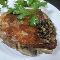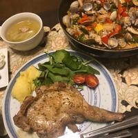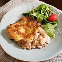 骨付きでなくてもチキンをシンプルに焼く時にはこちらのレシピが好きです。調味料の分量や焼き時間は肉の大きさや厚みによるので加減がなかなか難しい。今回は350グラムのモモ肉の裏側に切れ目を数ヶ所入れて、スパイスミックス1袋かけて、皮目を焼いた後、白ワインかけて弱火で8分蒸し焼き。これでちょうど良かったです。