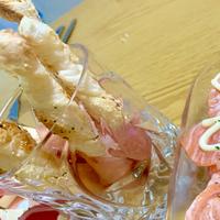 - 5 生ハムを縦3等分に切り、4に巻きつけて完成です。
