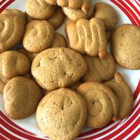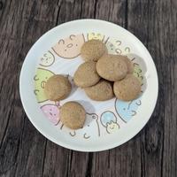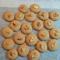 クルミを乗せた直径3㎝ほどのクッキーが60個程出来ました。生地と生地との間を多めに空けた方が、くっつかなくて済むと思います。