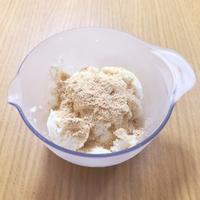 - 2 ボウルに1を入れてなめらかになるまで泡立て器でかき混ぜ、はちみつを加えてさらに混ぜます。