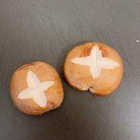 米印の形のほか、十字でもよいです。椎茸の大きさに合わせてカットしてください。 動画では削ぐような形で切り取っていますが、包丁で切り込みを入れるだけでも味の染み込みはよくなります。軸の側にも十字に包丁を入れると、さらに火の通りがよくなりますよ。