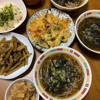 そばを茹でている間に、山菜をつゆに浸しておきました。