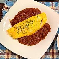 夢のコラボレーション、オムライスにカレーをかけました。 ふわふわの卵がカレーと絡み、ほんのり香るガーリックライスとの相性は抜群です。 特別な日や大切な人へのおもてなしの一品として、ぜひお試しください。