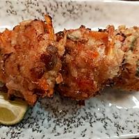 冷蔵庫の中の野菜(椎茸、ピーマン、人参、ごぼう、じゃがいも、玉ねぎ)たっぷりと刻んだエビも入れて作りました。片栗粉をまぶすのを忘れてしまったが、味はバッチリ🌈💙