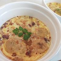 - 5 耐熱皿に4を流し入れ、160℃に予熱しておいたオーブンで25分焼き、最後にシナモンパウダーを振りかけ、ミントをのせたら完成です。