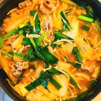 白菜、スライサーで薄切りにした大根、ニラ、豚こまで作りました。切って煮るだけで楽なのに彼氏も喜んでくれて美味しかったです☺️