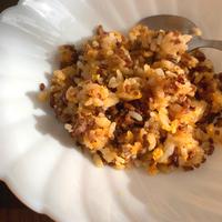 - 5 ごはんを入れて全体に合わせるように炒めたら、溶き卵を流し入れ、固まり始めたら全体と混ぜ合わせ、強火で炒めます。