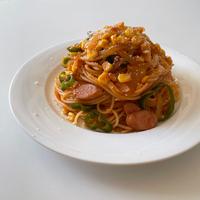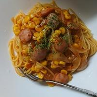 - 準備 スパゲティは沸騰したお湯に塩小さじ2を加え、パッケージの表記の通りに茹でて、ザルに上げておきます。茹で汁は20ml取っておきます。ピーマンは種を取り除き、千切りにしておきます。玉ねぎは薄切りにしておきます。ウインナーは5mm幅の斜め切りにします。コーンは水気を切っておきます。