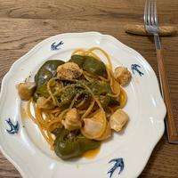 - 3 全体に馴染んだら、スパゲティを加え中火で炒めます。全体が混ざったら、1を加え、塩、白こしょうを振り、全体に味が馴染んだら火から下ろします。