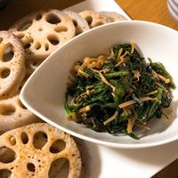 - 3 しっかり水切りした春菊は食べやすいサイズにカットし、塩昆布となめ茸を和えて完成です。