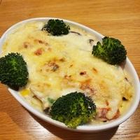 玉ねぎ、しめじ、人参、ジャガイモ、サツマイモ、ソーセージ、コーン、グリンピースをホワイトソースで炒めて上にブロッコリーを載せてトースターで10分。我が家の定番のグラタンです。