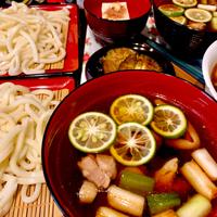 すだちの代わりに かぼすを使いました。柑橘の爽やかな香りに鶏とネギの旨味で冷たいうどん。美味しくいただきました。