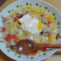 私はトマトとしめじも追加し、卵は溶いてから入れました。彩も綺麗で、栄養満点なのでまた作りたいと思いました。トマトの水分がでるので水の量を減らせば良かったと思います。