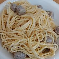 麺は普通のスパゲティで、生クリームの代わりに牛乳で、粉チーズがなかったのでピザチーズで作りました。あとハーブ入りソーセージで。にんにくは具としての食感がほしかったので、すりおろさず薄切りにしました。