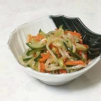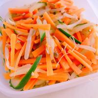 - 1 きゅうりはヘタを取り5cm長さの千切りにし、塩もみをします。にんじんは5cm長さの千切りにします。